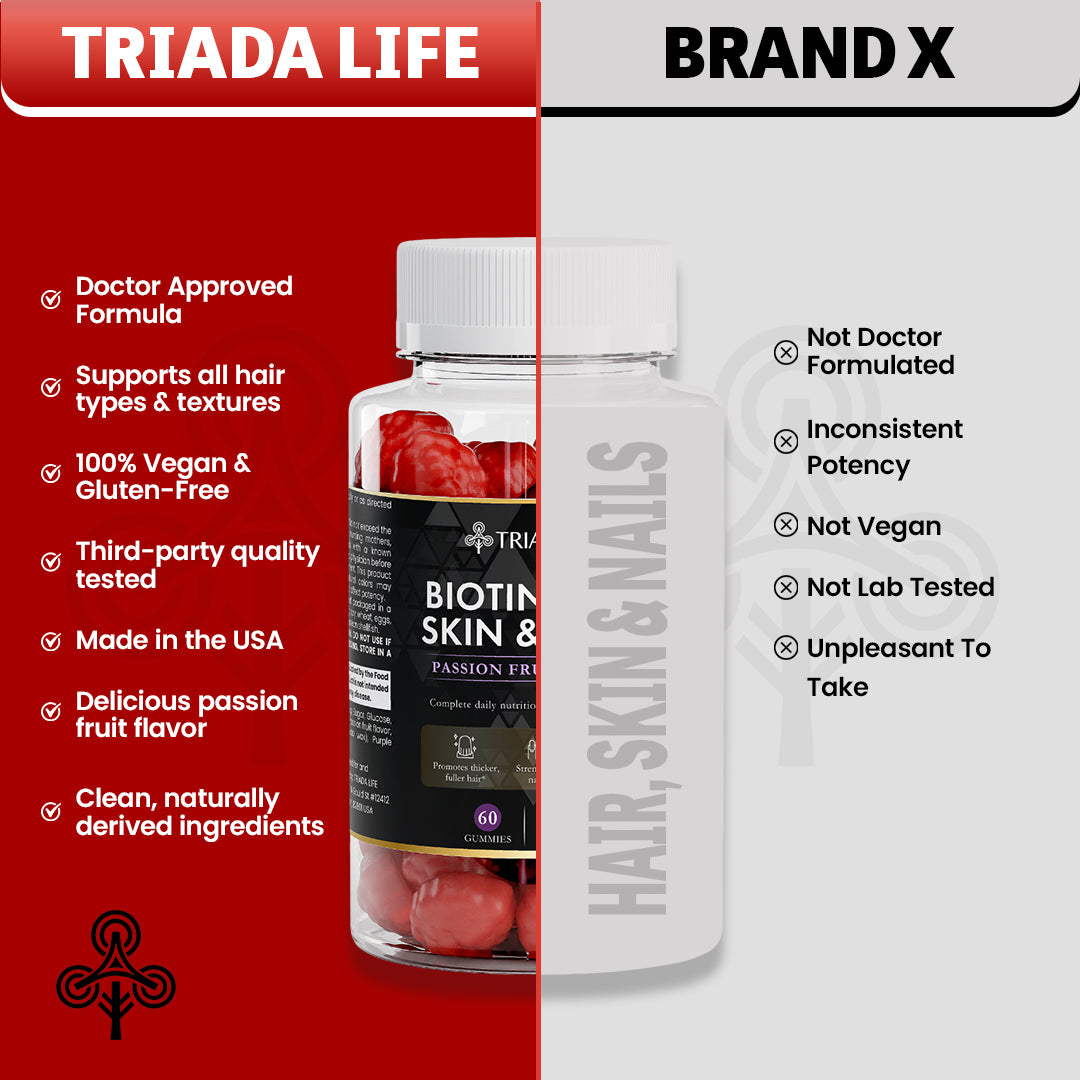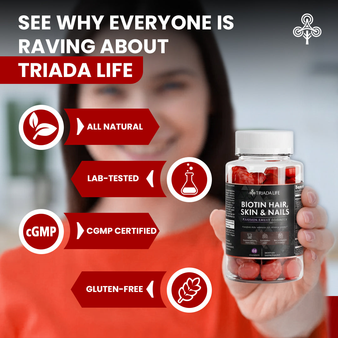 TRIADA LIFE Biotin Hair, Skin & Nails Gummies pack biotin, folate, zinc, and essential vitamins into one complete formula designed for beauty from within. Unlike hard-to-swallow capsules or low-potency blends, our gummies are easy to take, highly absorbable, and actually effective. Simplify your supplement routine with Biotin Hair, Skin & Nails gummies and experience comprehensive health support in just one dose.