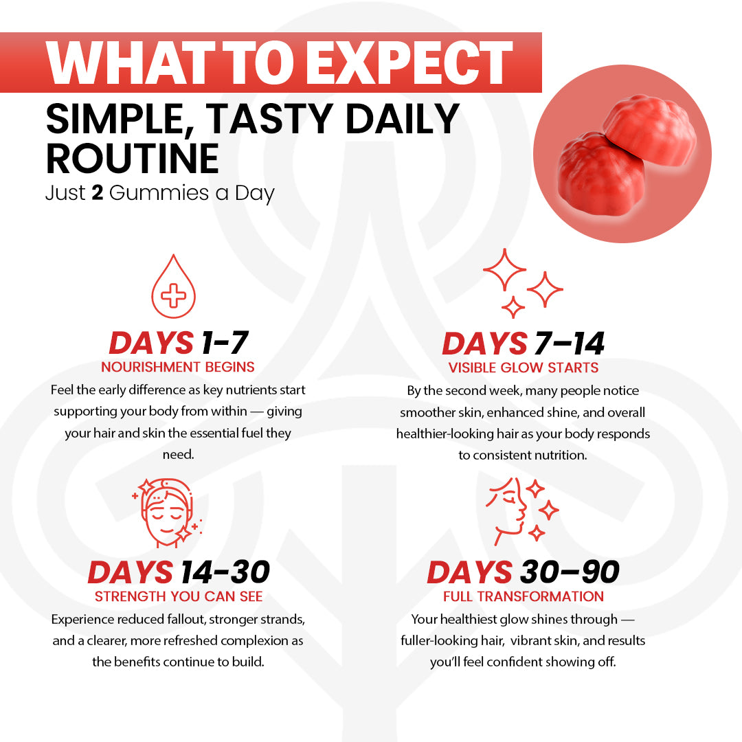 For optimal results, take two gummies daily with food. Consistent daily use is key to seeing transformative benefits for your hair, skin, and nails.
